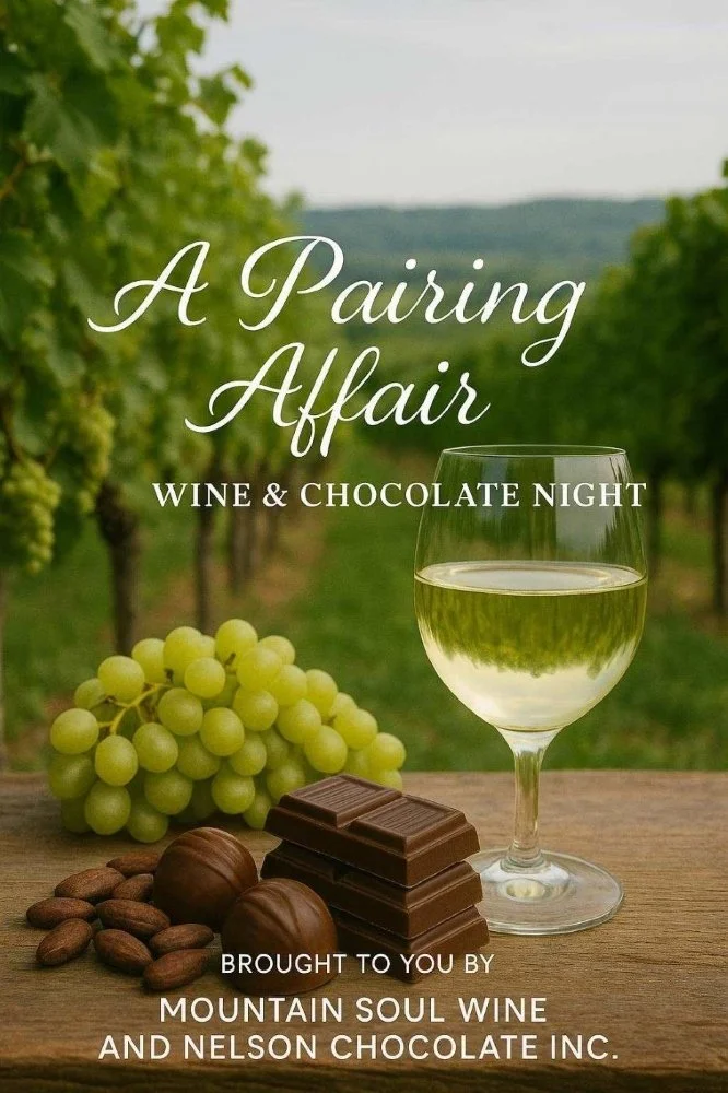 Join us for a sophisticated evening of wine, chocolate, and conversation under the tent at Mountain Soul Wine and Schoki Chocolate from Nelson Chocolatier